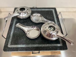 Set per raclette con pietra ollare, ideale per cene conviviali. - Base in legno. - Supporto in metallo. - Due bruciatori. - Due palette incluse.