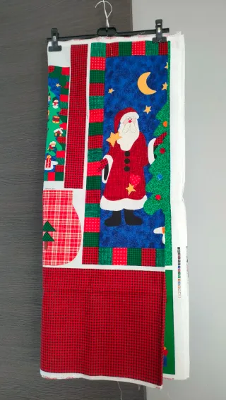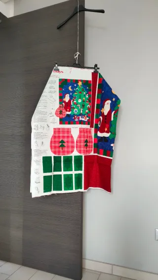 Pannello in tessuto a tema natalizio, perfetto per progetti creativi. Pannello in stoffa da ritagliare e assemblare. Vedi istruzioni - Design con Babbo Natale, alberi e fiocchi di neve. - Bordi decorativi a quadri rossi e verdi. - Tessuto stampato con dettagli festivi.