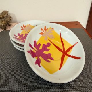 Set di quattro piattini da caffè con un design vivace e moderno. - diametro 12 cm - Decorazione astratta con forme floreali. - Colori brillanti su base bianca.