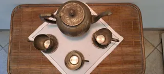 Elegante servizio da tè composto da teiera e tre tazze con sottobicchieri, realizzato in metallo con finiture dorate e argentate. - Teiera con manico e beccuccio. - Tre tazze con manici. - Tre sottobicchieri abbinati. - Decorazioni floreali e architettoniche.