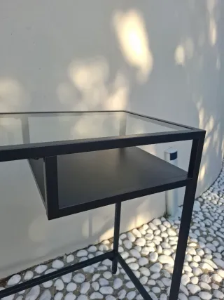 Elegante console IKEA VITTSJÖ con struttura in metallo nero e piano in vetro trasparente. Perfetta come mobile d'ingresso o tavolino. - Design moderno e minimalista. - Ripiano aggiuntivo per maggiore spazio.