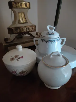 Set di tre zuccheriere in porcellana bianca con dettagli dorati, prodotte da due importanti manifatture: Ginori e Laveno - Zuccheriera con decorazioni floreali. - Zuccheriera con bordo dorato. - Zuccheriera con decorazioni geometriche blu e oro.