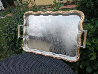 Elegante vassoio di ispirazione marocchina, perfetto per servire o come pezzo decorativo. - Design intricato con finiture dorate e argentate. - Manici laterali per una presa comoda. - Realizzato in metallo resistente.