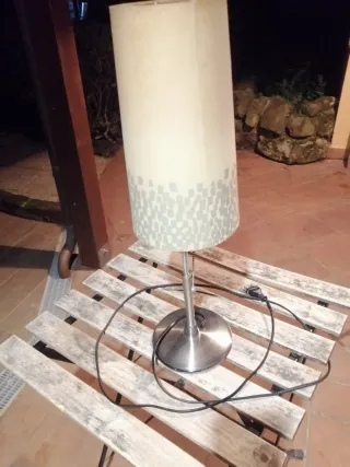 Lampada da tavolo dal design vintage, perfetta per aggiungere un tocco di stile alla tua casa. Il paralume presenta una decorazione a motivi geometrici. - Interruttore a catenella per un facile utilizzo. - Base e stelo in metallo lucido. - Paralume in tessuto con fantasia a blocchi grigi.