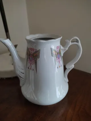 Set composto da teiera e lattiera in porcellana, con un elegante decoro. - Teiera con beccuccio e manico. - Lattiera con manico. - Decorazioni colorate su sfondo bianco.