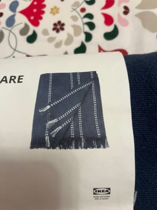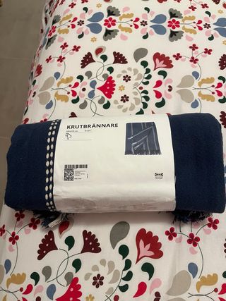 Copridivano IKEA KRUTBRÄNNARE, nuovo e ancora nella sua confezione originale. Le sue dimensioni sono 130x170 cm. - Design con motivi geometrici e frange. - Aggiunge un tocco di stile e praticità alla tua casa.