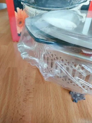 Pirofila in vetro Pyrex con elegante supporto in silver plade e coperchio - Pirofila in vetro trasparente. - Supporto in silver plade Prodotto imballato