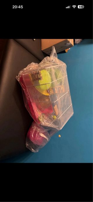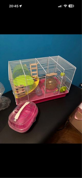 Set composto da gabbia per criceti e trasportino. - Gabbia con accessori interni. - Trasportino pratico e sicuro. Gabbia multicolor per criceti, usata ma in ottime condizioni, con dispenser acqua, ciotolina cibo, due ruote, casetta, scivolo, altalena e due scale di legno. Più trasportino fucsia. La vaschetta sotto presenta piccolo segno di usura dovuto ai truccioli di legno, nella parte sinistra in basso, come da ultima foto.