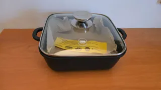 Pentola quadrata con coperchio Berndes. Caratteristiche. Elevato spessore 6mm: l'elevato spessore del fondo e dei bordi garantisce solidità e indeformabilità allo strumento. Al contempo, grazie all'uniformità di distribuzione del calore che si mantiene nel tempo dato l'elevato spessore, è possibile mantenere al caldo le pietanze. Rivestimento antiaderente: adatto per una cucina a basso contenuto di grassi. Privo di PFOA, Nichel e Bisfenolo A. Dimensioni : 25x25x9.cm. Articolo mai usato,come si vede dal fondo, sempre in un mobile. Piccolissime imperfezioni evidenziate nelle ultime foto, sul pomolo del coperchio e sui manici. Nessu
