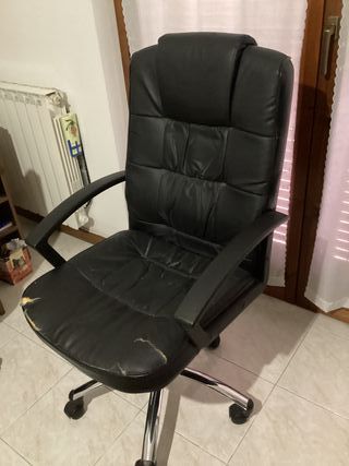 Poltrona da ufficio con finiture in similpelle, adatta per scrivania. La base è in metallo e plastica, con ruote per facilitare lo spostamento. Misure seduta 50x50 c.a. H. Schienale 65, altezza regolabile con pistone e base girevole, sul davanti della seduta presenta delle rotture come da foto. Zona Arezzo Civitella, se non lontani ve la porto a domicilio, contattare pure.
