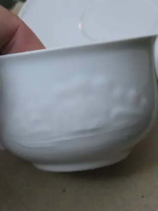 Elegante set da colazione Mulino Bianco. 6 Tazze con manico grandi 6 Piattini coordinati. In porcellana bianca Serie " Le Rondini Mulino bianco "