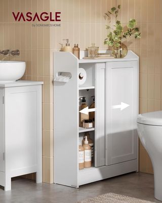 Mobile da Bagno, Salvaspazio, Porta Carta Igienica e Scomparto per Spazzola, Ante Scorrevoli, Ripiani Regolabili, Vicino al WC, 20 X 60 X 80 Cm, Bianco Nuvola BBC752W01