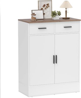 Questo mobile da cucina misura 68.6L x 35P x 90.3A cm e offre due cassetti e un armadio con ripiano regolabile su tre livelli, ideale per riporre stoviglie e piccoli elettrodomestici. Realizzato in truciolato con superficie in melaminico, è facile da pulire e supporta fino a 50 kg (10 kg per cassetto/ripiano). Include un kit anti-ribaltamento per maggiore sicurezza e piedini antiscivolo per proteggere i pavimenti. Montaggio richiesto. Colore: bianco e marrone scuro. Perfetto per saloni, cucine e sale da pranzo, questo mobile combina eleganza e funzionalità.