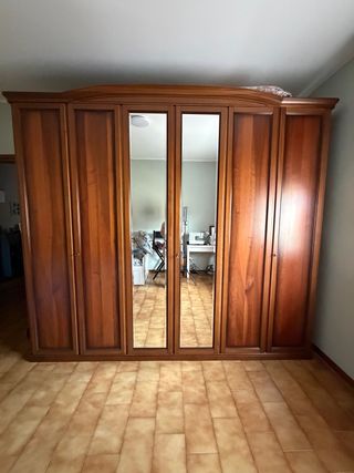 Vendo camera da letto classica in legno (Armadio 6 ante + Comò). Mobili di qualità, solidi e ben tenuti. L'armadio a 6 ante ha ripiani interni, aste appendiabiti e include anche una comoda cassettiera interna e due specchi integrati sulle due ante centrali Il set è già stato smontato con cura ed è pronto per il ritiro. Quindi comodissimo da caricare direttamente su furgone senza fare scale. Tutti i pezzi e gli specchi sono presenti. Le foto mostrano i mobili montati.