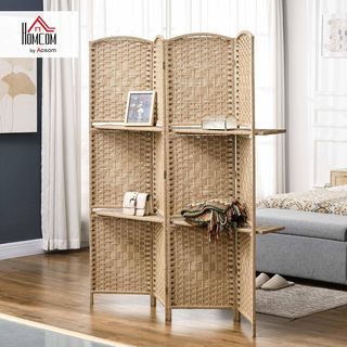 Il paravento pieghevole HOMCOM a 4 ante misura 160L x 1,6P x 170A cm e si ripiega a 40L x 6,4P x 170A cm. Realizzato in legno di pino e pannelli in fibra di carta, offre robustezza e stile. Include due ripiani rimovibili, ciascuno con capacità di peso di 5 kg, per riporre oggetti e decorazioni. Il design leggero facilita il trasporto e non richiede montaggio. Le gambe sollevano la base per evitare l'umidità. Perfetto come divisorio per stanze, combina funzionalità ed eleganza con un motivo a diamante e una parte superiore arcuata.