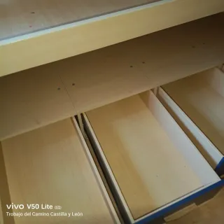 In vendita separatamente o tutti insieme (decorazione non inclusa). La camera da letto è molto completa, è composta da 3 armadi a due ante (uno è angolare e ha una porta), 2 uffici, i cui tavoli escono e le loro coperte sono rialzate come una scrivania con spazio interno, 1 libreria, 1 ponte sopra le testate dei letti, soffitte e 2 letti di 1,05 cm di cui vengono venduti solo i mobili, senza base o materasso. Occupano 5 m su una parete e 3 m sull'altra; 2,36 m di altezza. Alcune maniglie sono rotte, ma possono essere raggiunte.