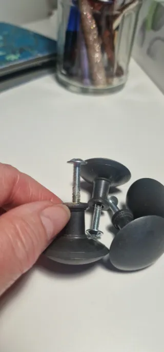 Set di 6 maniglie o pomelli per mobili della serie Hemnes di Ikea. Sono di colore nero/grigio e realizzati in metallo. Design ovale. Include viti per l'installazione.