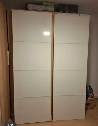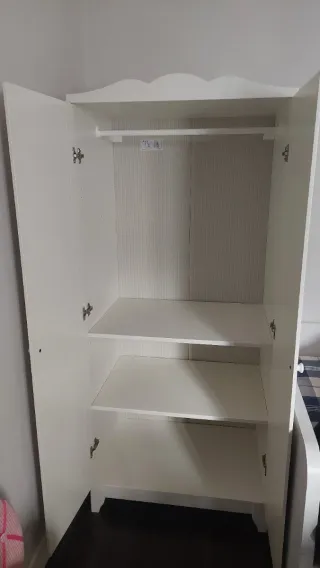 Guardaroba bianco a due ante - ampio e funzionale. Vendo guardaroba bianco a due ante scorrevoli, molto pratico per camere da letto piccole o medie poiché non necessita di spazio extra per aprire le porte. Interno con barra per appendere i vestiti e ampio spazio di archiviazione. Ideale per vestiti, cappotti o cambio di stagione. Stato: usato, con alcuni piccoli difetti estetici (piccoli colpi/sfregamenti su una delle porte, vedere le foto), ma perfettamente funzionale. Colore: bianco. Tipo: ante scorrevoli. Molto leggero visivamente e facile da abbinare. Si vende per cambio di mobili.