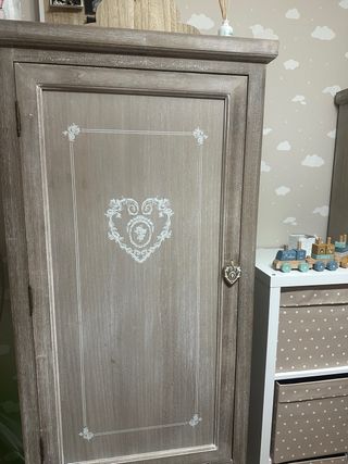 Guardaroba in legno con un design elegante e dettagli decorativi. Finitura in tonalità beige e marrone. Frontale con cornice e cuore decorativo. Maniglia a forma di cuore.