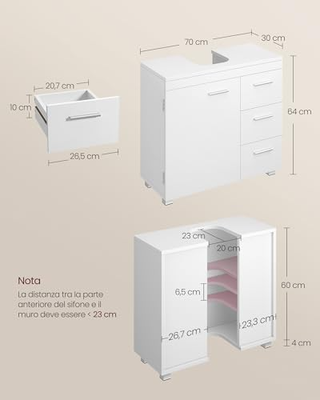 [Adatto a varie tipologie di lavabi] Che tu abbia un lavabo con o senza colonna, questo mobile da bagno farà al caso tuo. Presta attenzione alle dimensioni dell’apertura per la colonna sul retro e del mobile per assicurarti che questo mobiletto sia adatto [Spazio ordinato] 3 grandi cassetti a lato, 2 scomparti dietro l’anta: questo mobile sottolavabo offre spazio per permetterti di mantenere in ordine accessori da bagno, asciugamani, detersivi, ecc. [Ripiano regolabile in altezza] Il ripiano all’interno del mobile è regolabile in 3 altezze, in modo da poter riporre flaconi di shampoo e gel doccia di diverse dimensioni [Robusto, resi