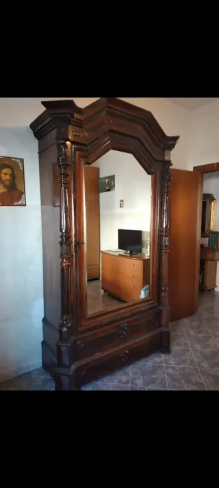 Armadio antico, stile Luigi Filippo, in palissandro caratterizzato da decorativi sulla parte superiore, cimasa, uno specchio centrale e due cassetti. Epoca: seconda metà dell'800. Contattare in privato Spedizione a carico dell'acquirente.