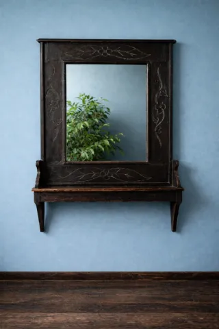 Elegante specchio da parete con una piccola mensola integrata, perfetto per aggiungere un tocco di stile retrò a qualsiasi ambiente. -altezza 94 -larghezza 60 -specchio alto 40 largo 34 - Cornice in legno scuro con intagli floreali. - Mensola sottostante per appoggiare piccoli oggetti. - Riflesso chiaro e definito. No Poste