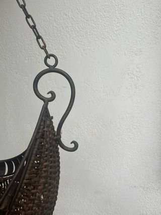 Elegante cesto sospeso, perfetto per aggiungere un tocco rustico ai tuoi spazi. - Struttura in metallo lavorato con finiture decorative. - Intreccio in vimini scuro per un look naturale. - Design a mezzaluna per un impatto visivo unico.