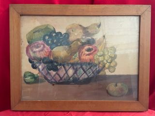 Quadro raffigurante una natura morta con cesto di frutta, realizzato a tecnica mista su carta. L’opera ritrae uva, mele, pere e altri frutti con un tratto morbido e tonalità calde, incorniciata in una cornice in legno che ne valorizza l’aspetto rustico ed elegante. Lo stile richiama la tradizione pittorica classica, ispirata alla scuola italiana e francese di metà Novecento, simile a quello di artisti come Giorgio Morandi o alcune opere decorative degli anni ’50-’60. Perfetto per ambienti dal gusto retrò, cucine, soggiorni rustici o arredamenti in stile country. Le misure precise sono riportate nelle foto. In buone condizioni generali, con lievi segni del tempo sulla cornice, che ne confermano l'autenticità e il fascino vintage.