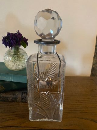 Bellissima bottiglia in vetro da whisky con targhetta in metallo argentato che ne identifica il contenuto. Il tappo rotondo e' sfacettato, il collo presenta un anello in metallo mentre i quattro lati della bottiglia sono caratterizzati da scanalature che raffigurano delle spighe di malto. Articolo elegantissimo adatto a valorizzare il carrello bar o per essere utilizzato come complemento d'arredo. La bottiglia misura 25 cm di altezza e 8 cm di larghezza.