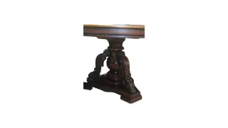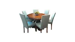 Caratteristiche Tavolo: - legno massiccio con finitura lucida e venature naturali - basamento centrale monumentale, riccamente intagliato, che garantisce massima stabilità e libertà per le gambe dei commensali - rotonda con bordo a scalino e possibilità di allungare per maggiore spazio Caratteristiche Sedie: - schienale alto per un supporto ergonomico - tessuto in una raffinata tonalità azzurro polvere/carta da zucchero - gambe in legno scuro coordinate alla base del tavolo Il tavolo presenta 2 graffi non troppo profondi e le sedie hanno imbottiture ancora rigide e tessuto leggermente scolorito. Disponibile per la revisione.