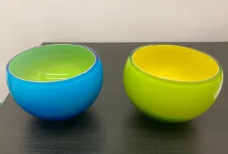 Set di due ciotole in vetro, perfette per decorare o per servire. Ciotola 1: esterno blu ceruleo/turchese con interno verde acido/lime. Ciotola 2: esterno verde mela con interno giallo sole. Presentano alcune scheggiature sul bordo ma sono prive di graffi. Misure: H 8 cm Diam. 12 cm