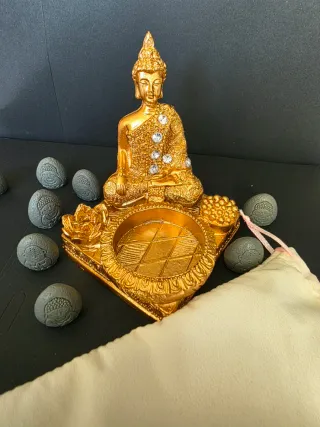 Bellissimo Buddha dorato, ideale per decorare o come oggetto di meditazione. Include pietre decorative grigie. - Buddha in resina dorata con dettagli in strass. - Base decorativa con motivi floreali. - Set di 8 pietre decorative in resina grigia con incisioni.