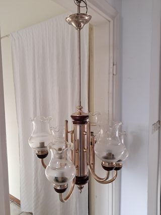 Lampadario in metallo e legno, con 6 luci e con portalampade e14. Coppe in vetro. Altezza corpo lampadario 50 cm. larghezza 48 cm. Asta soffitto lunghezza 49 cm. In alcuni punti il metallo si è ossidato.