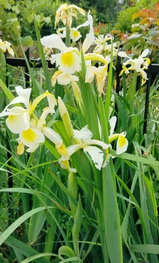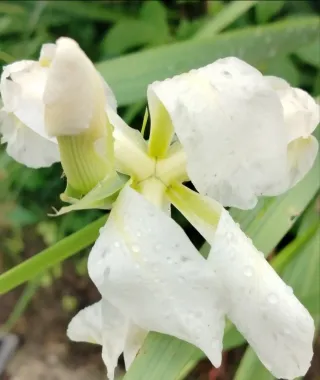 Pianta di Iris orientalis con fiori bianchi. Pianta perenne,a fioritura tardo primaverile. Cresce fino a 150 cm,con foglie molto sottili,alte,a spada. Fiori di 4-6 cm di diametro,bianchi, spruzzati di giallo al centro. Molto facili da coltivare,in pieno sole,sopporta il secco. D inverno perde le foglie ma rinasce dal rizoma già a fine inverno. Molto belli per fare bouquet. Piantine fatte da talea di rizoma e cresciute senza trattamenti chimici. Prezzo a singolo vasetto. Alcuni piantini hanno già sviluppato una seconda talea nello stesso vasetto