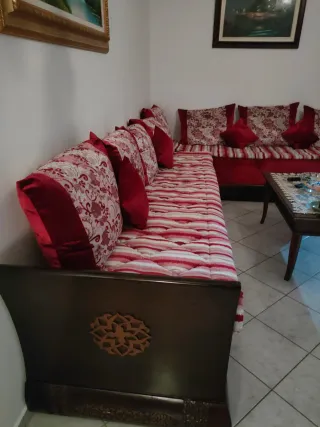 Eleganti divani angolari con dettaglio floreali abbinati ai cuscini. Struttura robusta in legno e materasso in spugna rivestito in tessuto rosso. Comprende 2 divani, materasso, copridivano, 8 cuscini grandi e 4 piccoli. MISURE (x singolo divano): 245 cm lunghezza struttura 225 lunghezza materasso Profondità 70 cm struttura Altezza materasso 30 cm Altezza struttura 50 cm