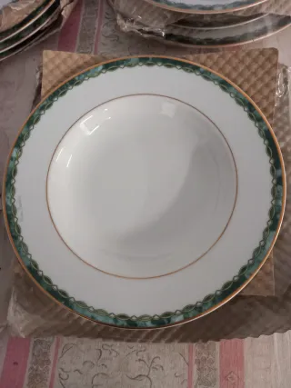 Elegante servizio di piatti in porcellana con un raffinato bordo decorato. - Bordo con motivo a onde verdi e linea dorata. - Design classico e intramontabile. - Quattro piatti piani, Quattro piatti fondi e quattro piatti frutta