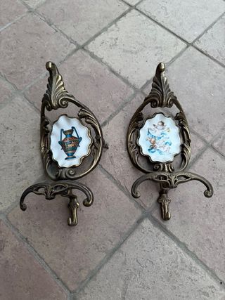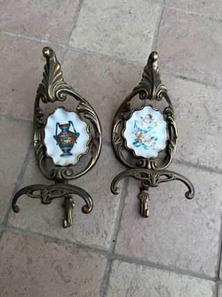 Coppia di appendiabiti in ottone con inserti in ceramica dipinta a mano. - Un appendiabiti presenta un'anfora greca. - L'altro appendiabiti raffigura un putto. - Design elegante e raffinato.