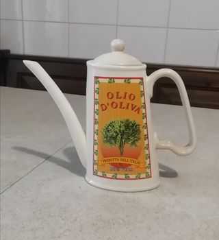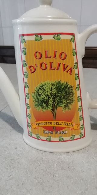 Bellissima oliera con coperchio vintage, usata ma senza rotture, stampa sul davanti, linea elegante. Capienza ml. 420.