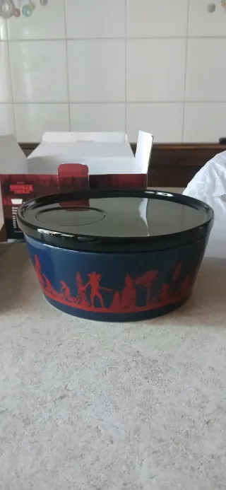 Set cena a tema Stranger Things, perfetto per i fan della serie. Nuovo in confezione originale. - Design ispirato alla serie Netflix. - Piatto fondo/ciotola colore blu con figure della serie in vivace colore rosso, piatto piano colore nero. Misure in foto.