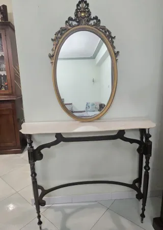 Elegante consolle da ingresso con specchio in stile antico. Un pezzo d'arredo che aggiunge un tocco di classe alla tua casa. Anni 50. - Piano in marmo. - Struttura in legno lavorato. - Cornice dello specchio con decoro barocco. Specchio ovale non macchiato.