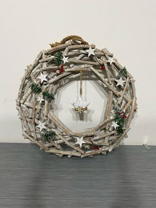Ghirlanda natalizia in legno perfetta per decorare la tua casa durante le feste. - con rami di legno sbiancato. - Decorata con stelle bianche, pigne verdi e bacche rosse. - Un'adorabile stella appesa al centro. - Diametro circa 46 cm.