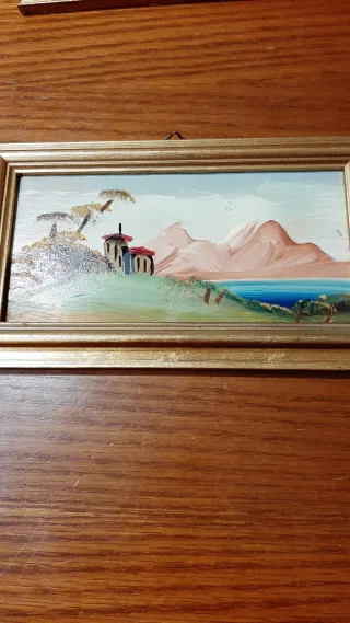 Deliziosa coppia di quadretti con paesaggi dipinti a mano, incorniciati in eleganti cornici color oro. - Raffigurano paesaggi sereni. - Cornici in oro. - Vetro protettivo.