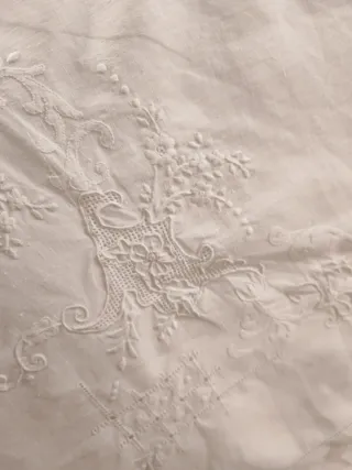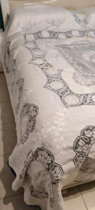 Elegante copriletto in lino e organza, con ricami e dettagli in pizzo di Filet modano... Mai usato, perfetto in tutto. Mis 270 /270 - Motivo floreale e bordi decorati. - Tessuto leggero e traspirante.