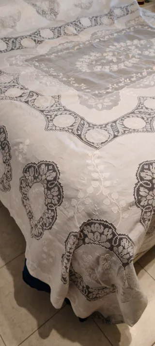 Elegante copriletto vintage con ricami raffinati. In sfilato siciliano, ancora inamidato... Mis 280/280 - Realizzato in lino di alta qualità. - Presenta un disegno centrale con figure e motivi floreali. - Bordi decorati con dettagli traforati.