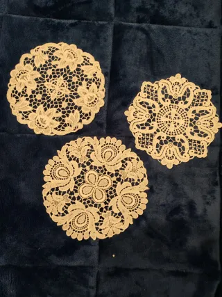 Set di tre centrini rotondi in pizzo macramè. Mis 18 cm ogniuno - Design floreale intricato. - Bordo decorato con motivo a onda. - Ideali per aggiungere un tocco di eleganza alla casa.