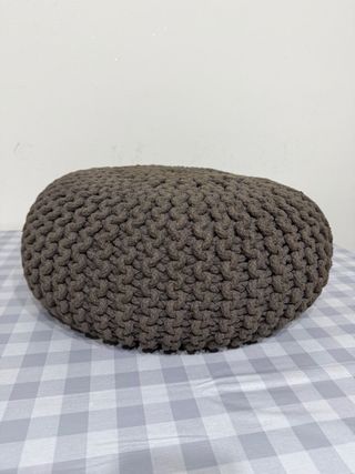 Pouf rotondo imbottito, realizzato a mano con una tecnica a maglia spessa. - Materiale: 100% filato. - Colore: tortora.