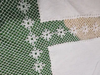 Elegante runner in pizzo, lavorato a mano con cura. Perfetto per aggiungere un tocco di raffinatezza alla tua tavola o come decorazione. - Design floreale intricato. - Bordi smerlati decorativi. - Tessuto leggero e arioso.