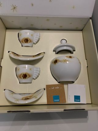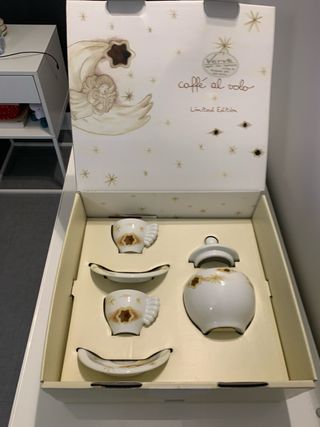 Vendo set THUN originale “Caffè al Volo” – Limited Edition, composto da: • 2 tazzine da caffè • zuccheriera • (confezione originale come da foto) Set elegante e raffinato, decorazione bianca e oro con dettagli a stelline, perfetto per collezionisti THUN o come regalo. Condizioni: ottime (come da foto) Edizione limitata Ideale per casa, collezione o idea regalo