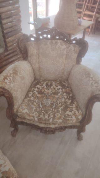 Elegante divano vintage con una struttura in legno intagliato e rivestimento in tessuto. - Design classico e raffinato. - Sedute comode e accoglienti. - Dettagli decorativi sulla struttura. Divano 160x80 Poltrona 100x80