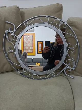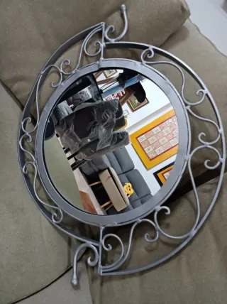 Elegante specchiera rotonda con una cornice decorata in ferro battuto. - Cornice in metallo lavorato. - Design con riccioli e dettagli ornamentali.